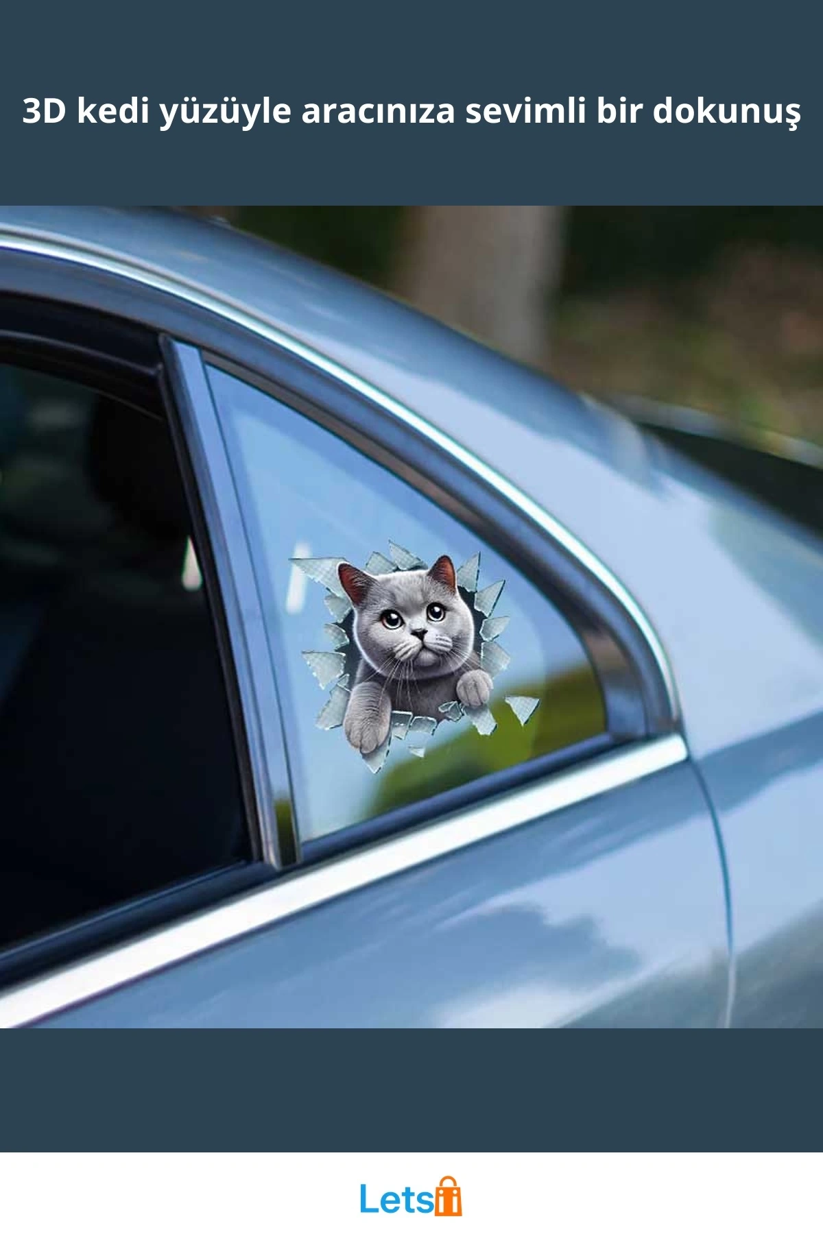 3D kedi yüzü tasarımı, arabanın camından dışarı çıkıyormuş gibi görünüyor.