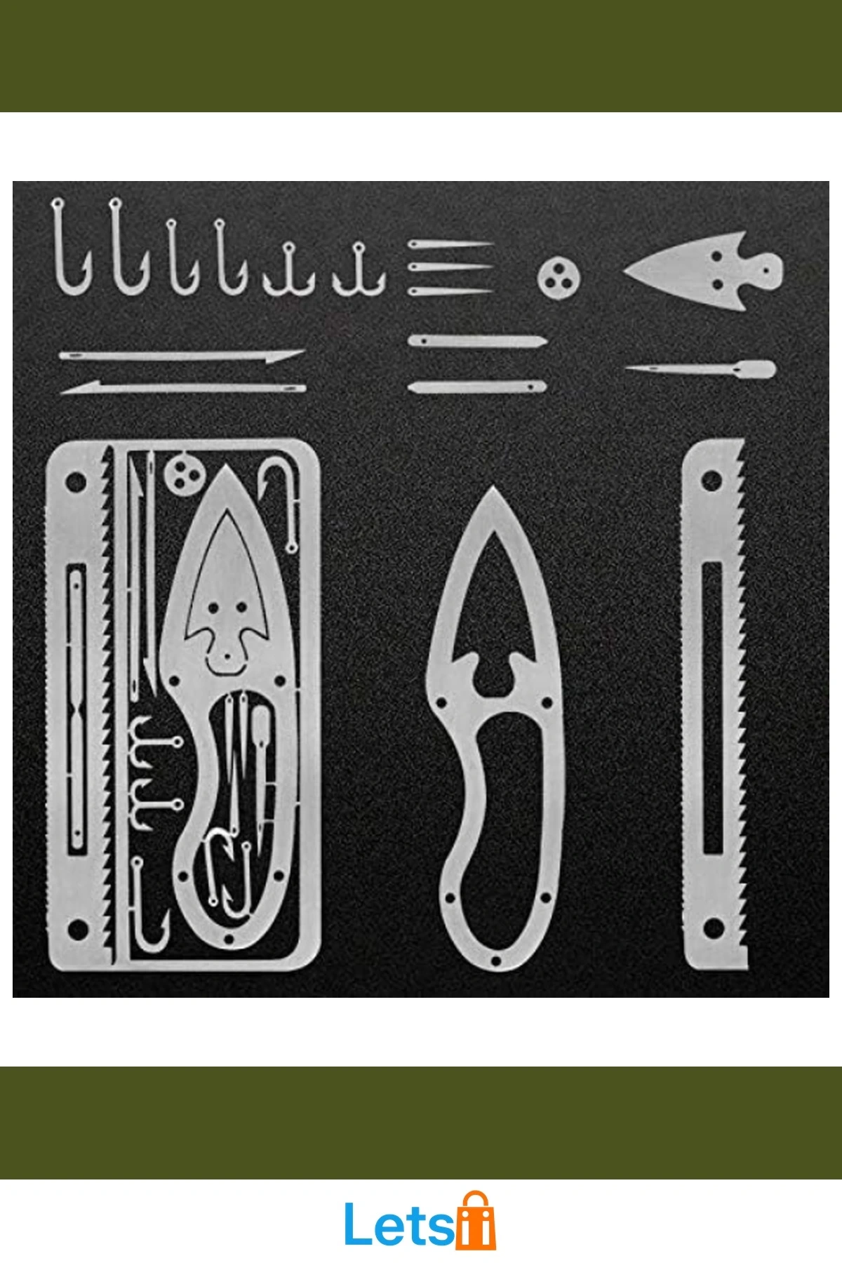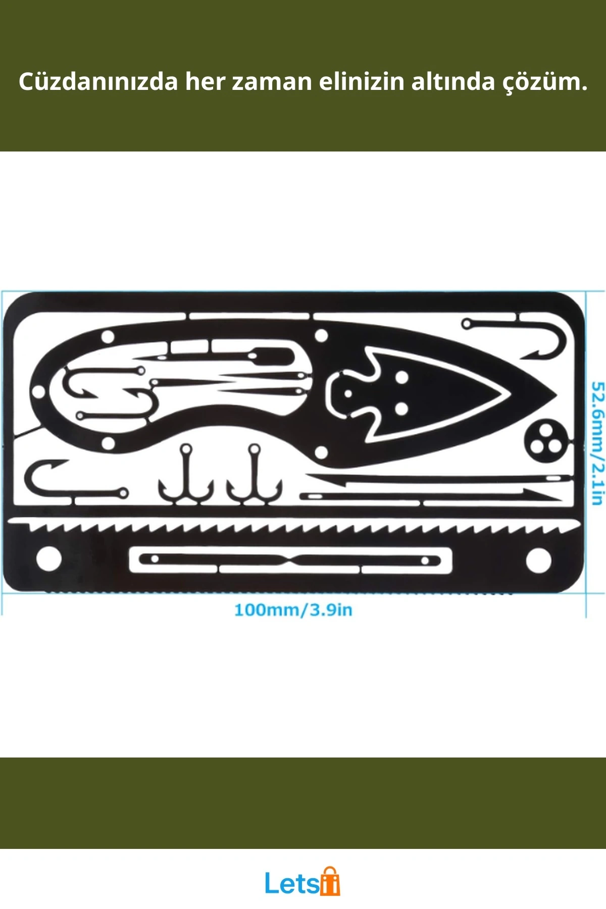 Bıçak, balık tutma kancası ve testereli kenar içerir.