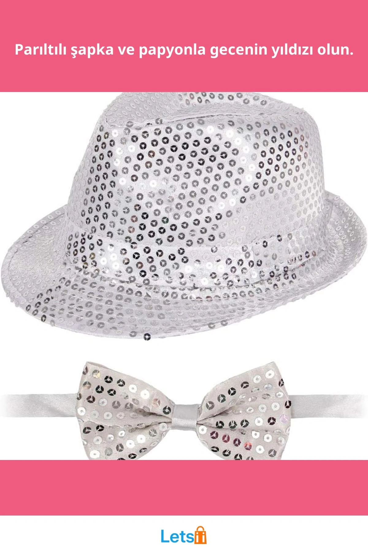 Gümüş payetlerle bezeli şapka ve papyon seti, şıklığınızı tamamlayacak!