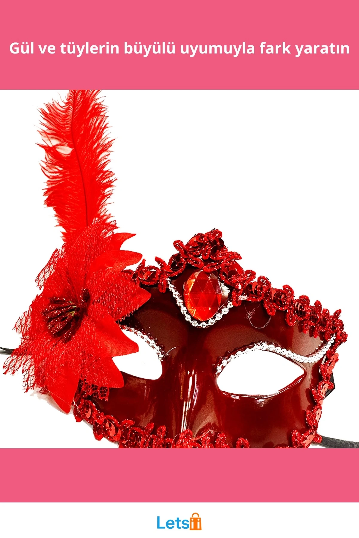 Paket içerisinde 1 adet kırmızı güllü ve tüylü Venedik maskesi bulunmaktadır.