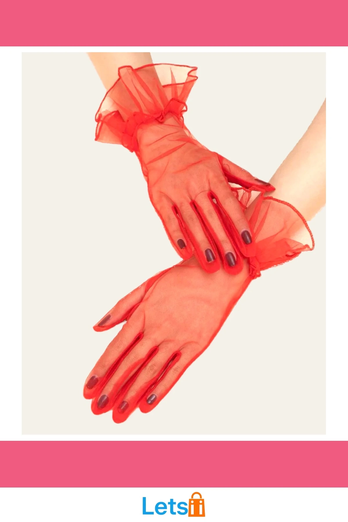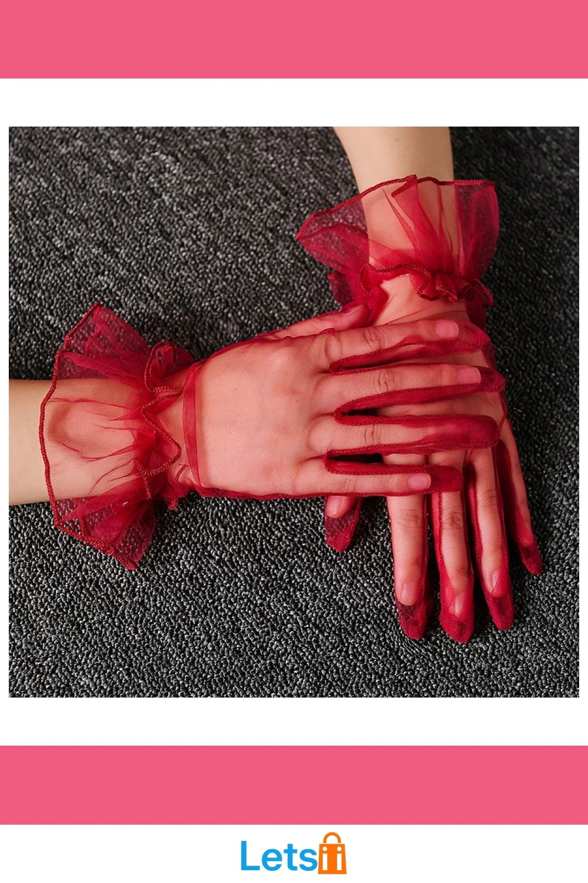 Kısa Boy Likralı Güpürlü Yetişkin Tül Eldiven Kırmızı