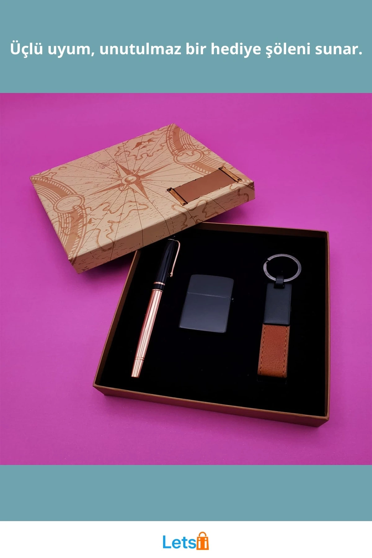 Kişiselleştirilebilir 3'lü Hediye Seti Kalem, Anahtarlık, Çakmak