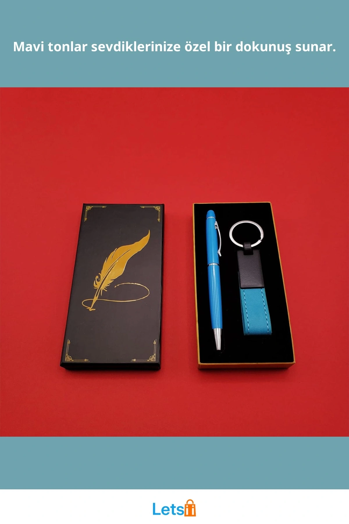 Şık ve modern bir hediye alternatifi arıyorsanız, Letsii'nin mavi metal deri anahtarlık ve kalem seti tam size göre!