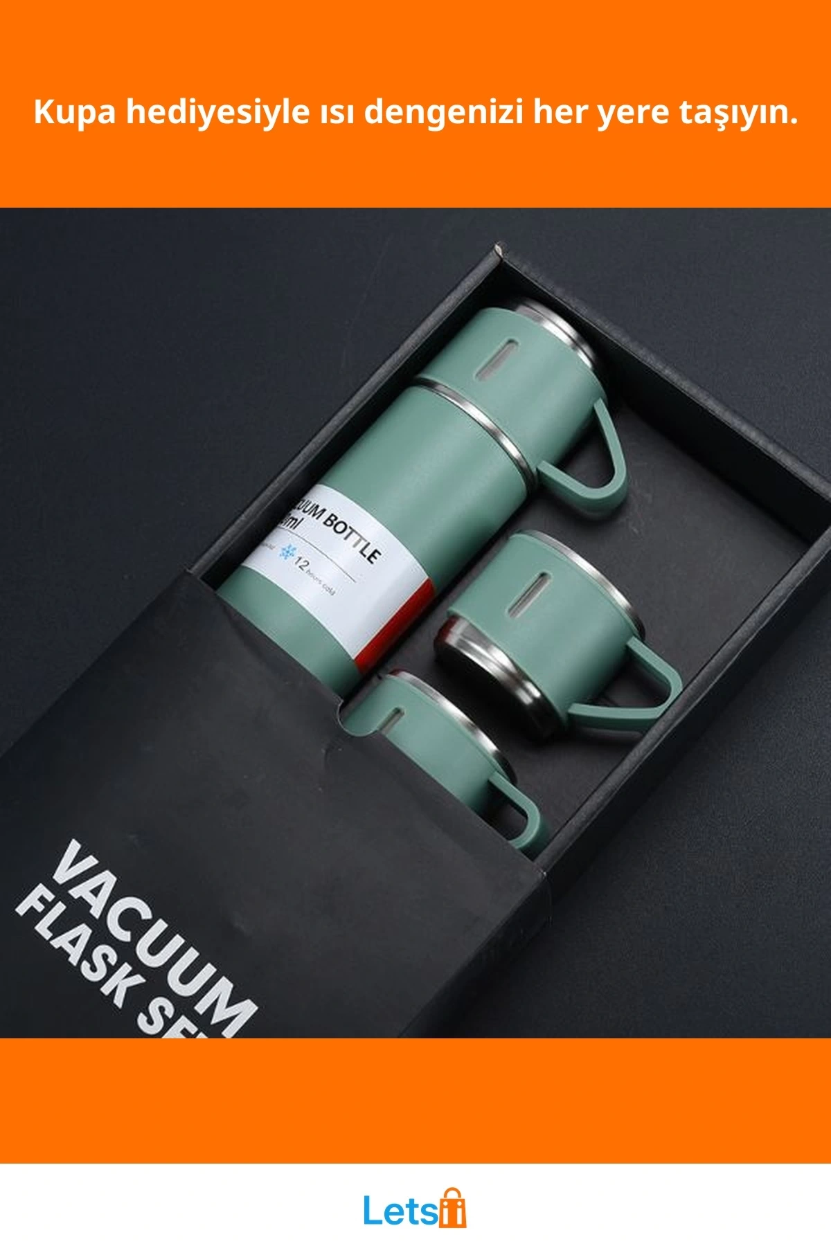 Paslanmaz Çelik 500ml Termos ve 3 Adet Bardaklı Set