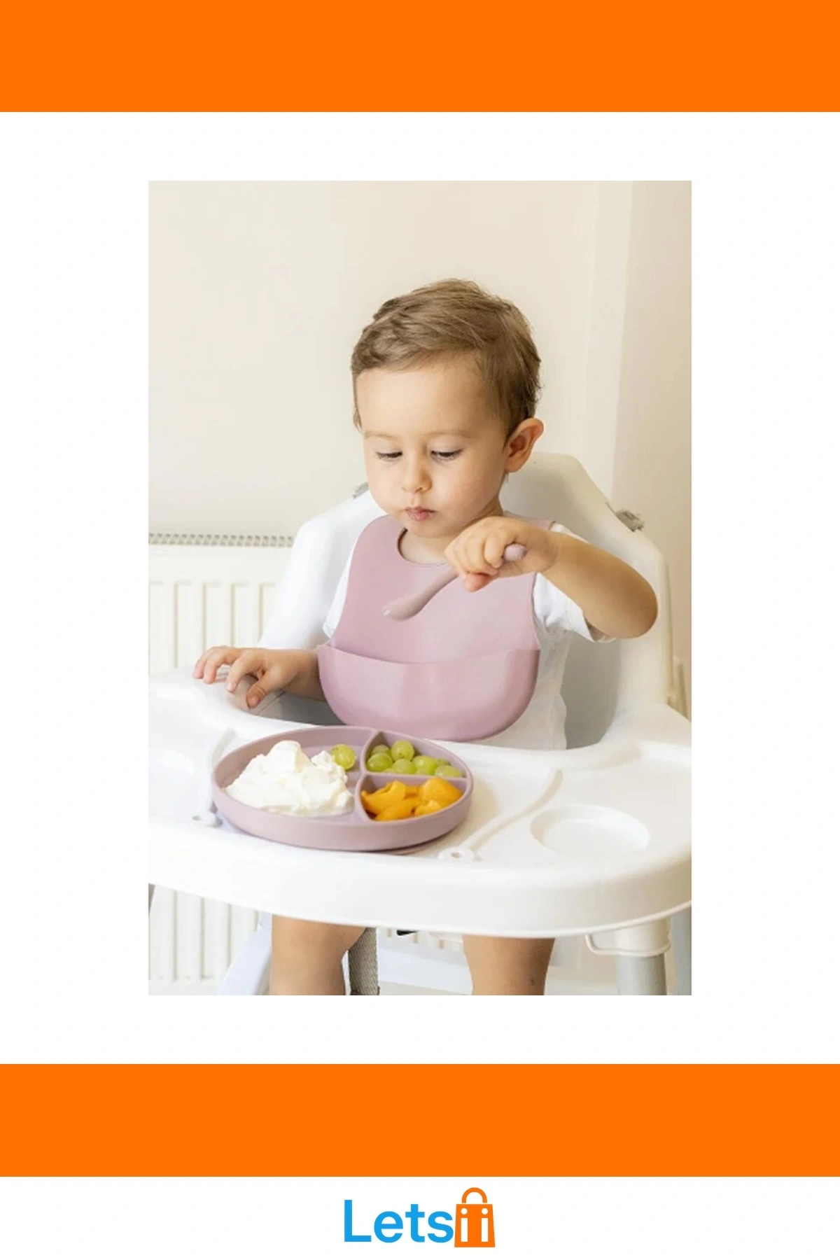 Set içerisinde 1 adet vakumlu 3 bölmeli tabak, 1 adet diş kaşıyıcılı silikon kaşık ve 1 adet ayarlanabilir mama önlüğü bulunur!