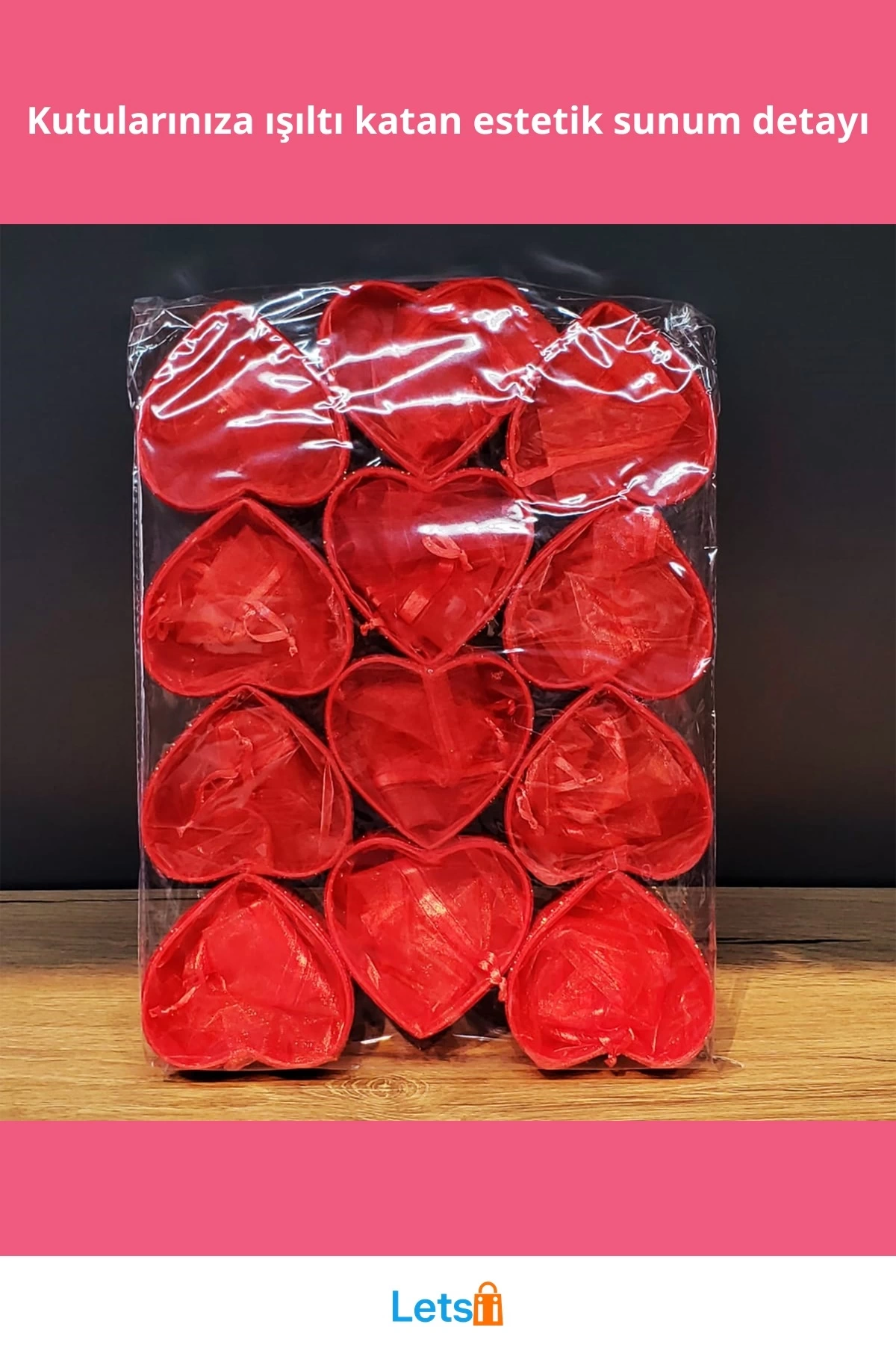 Paket içeriğinde 1 adet Kırmızı Kalpli Tül Kese bulunmaktadır.