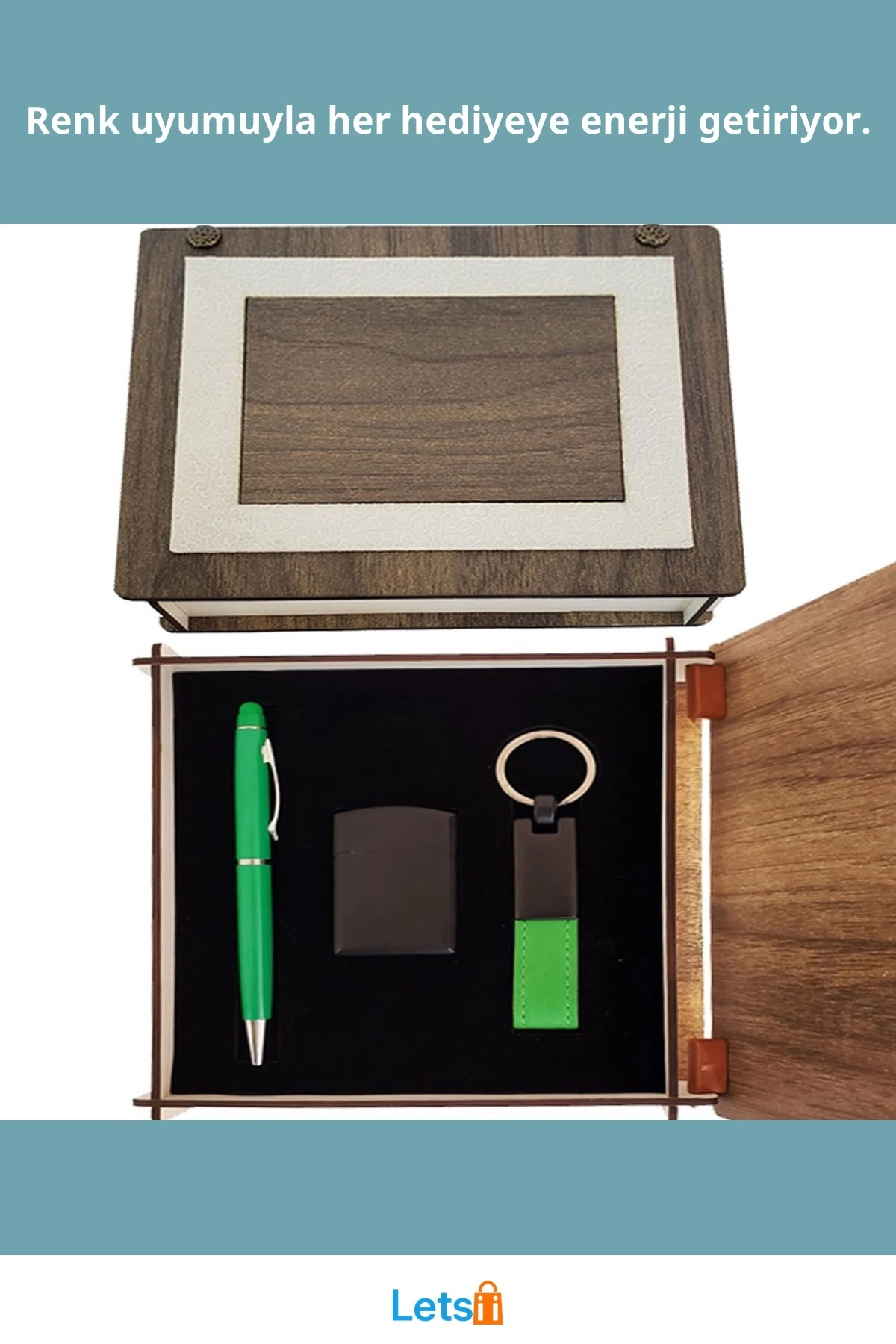 Şık Yeşil Ahşap Kutulu Kalem Anahtarlık ve Çakmak Seti