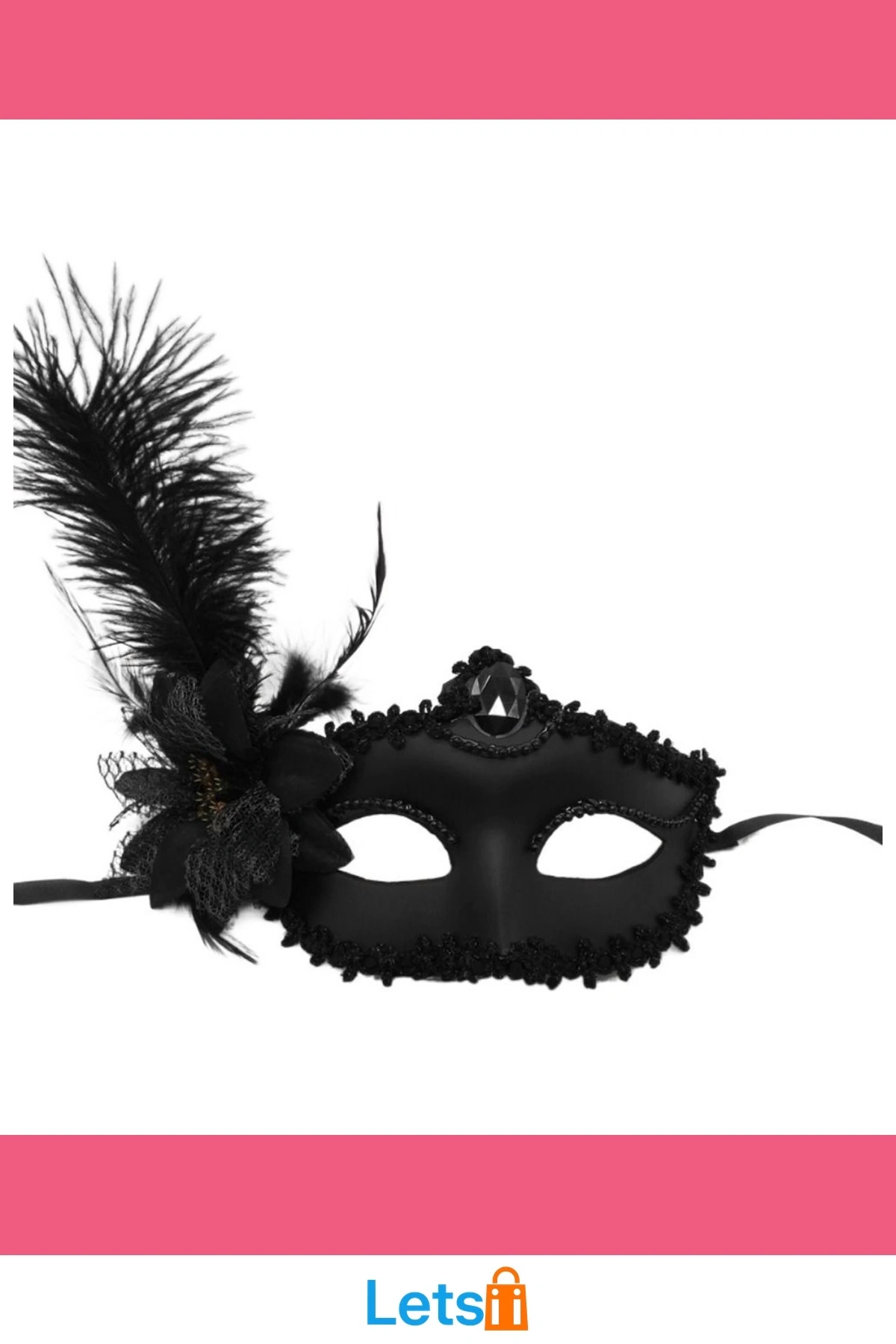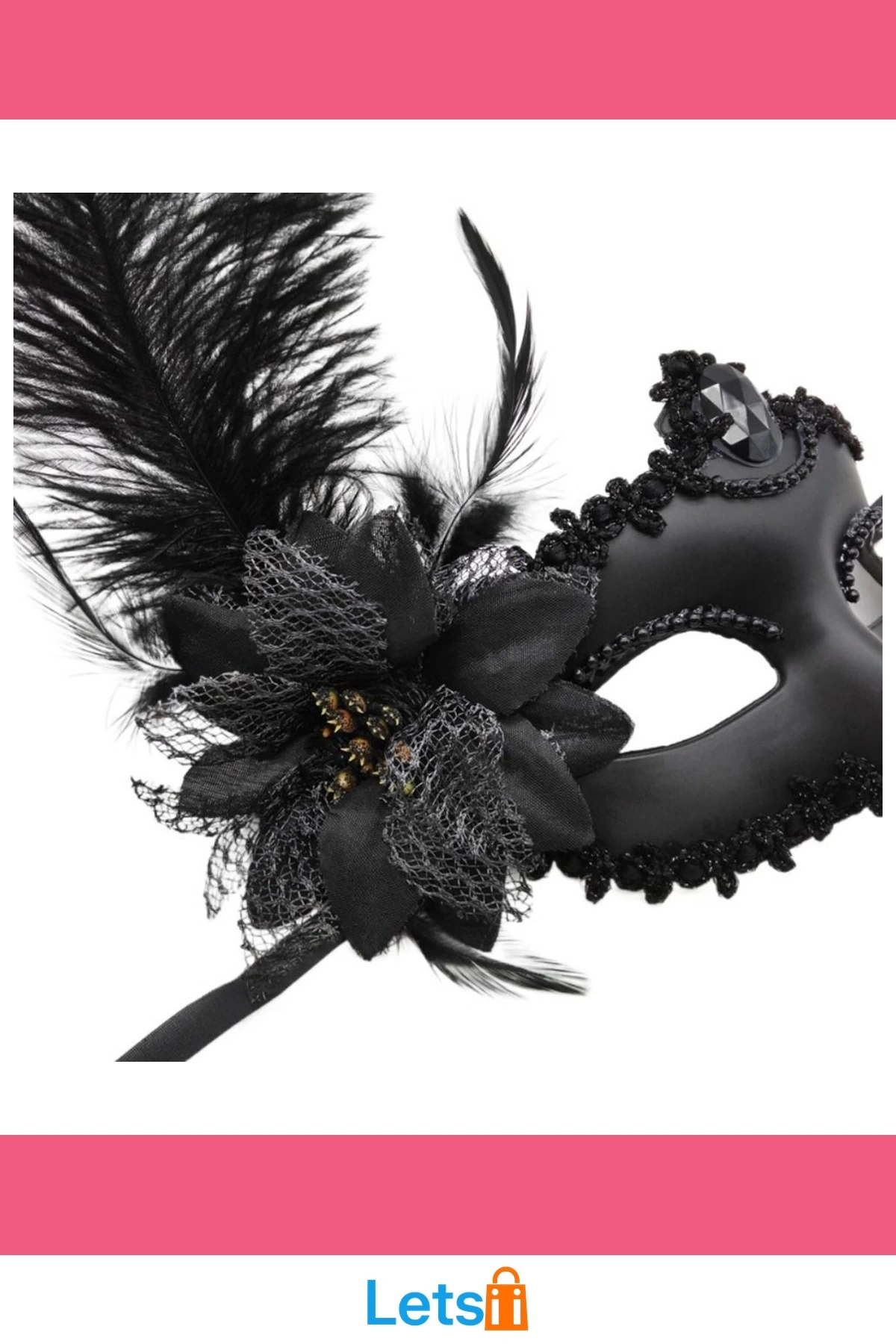 Siyah Mat Renk Yandan Tüylü Güllü Venedik Maskesi