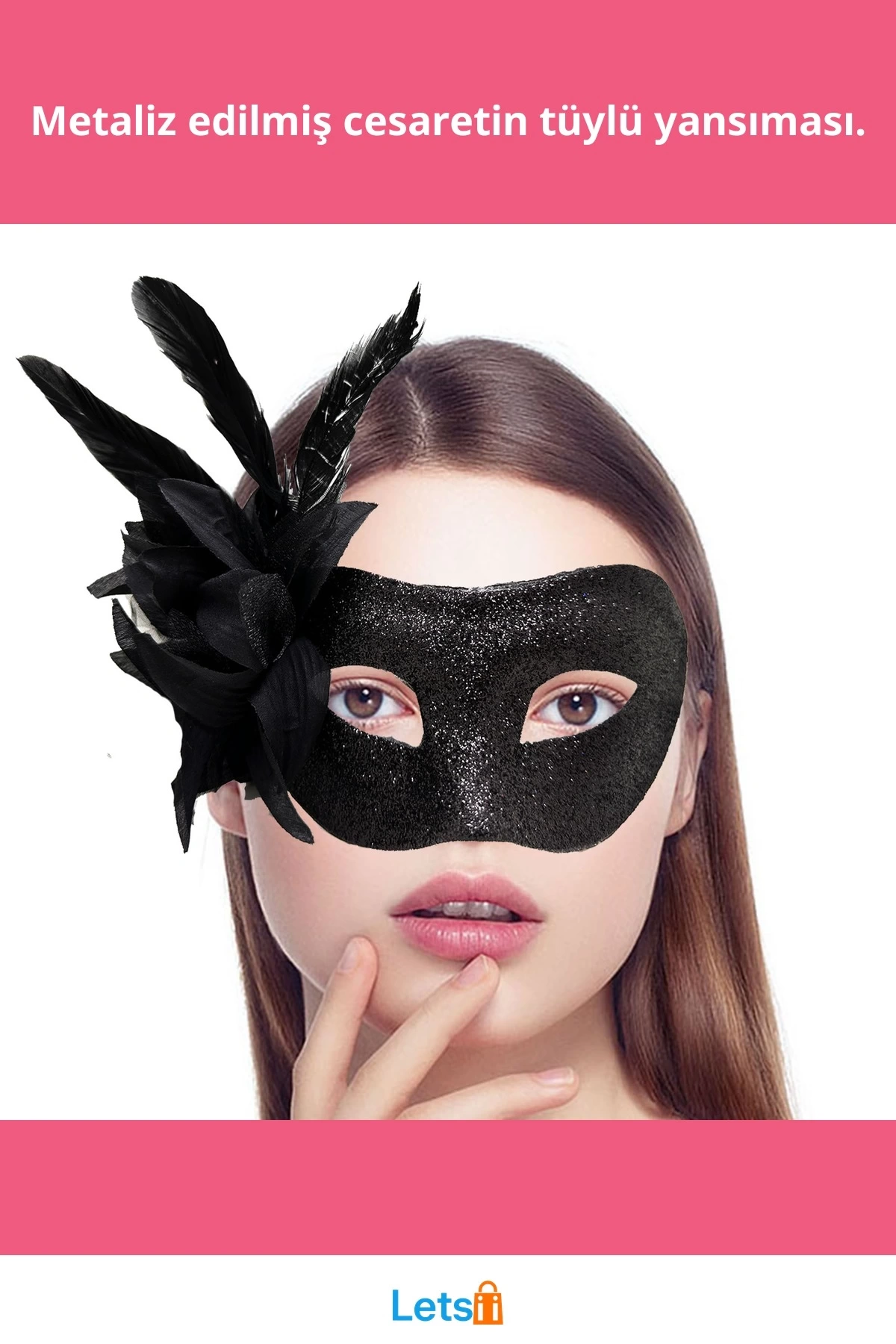 Şık tüylü detaylar, maskenize ekstra bir zarafet katıyor.