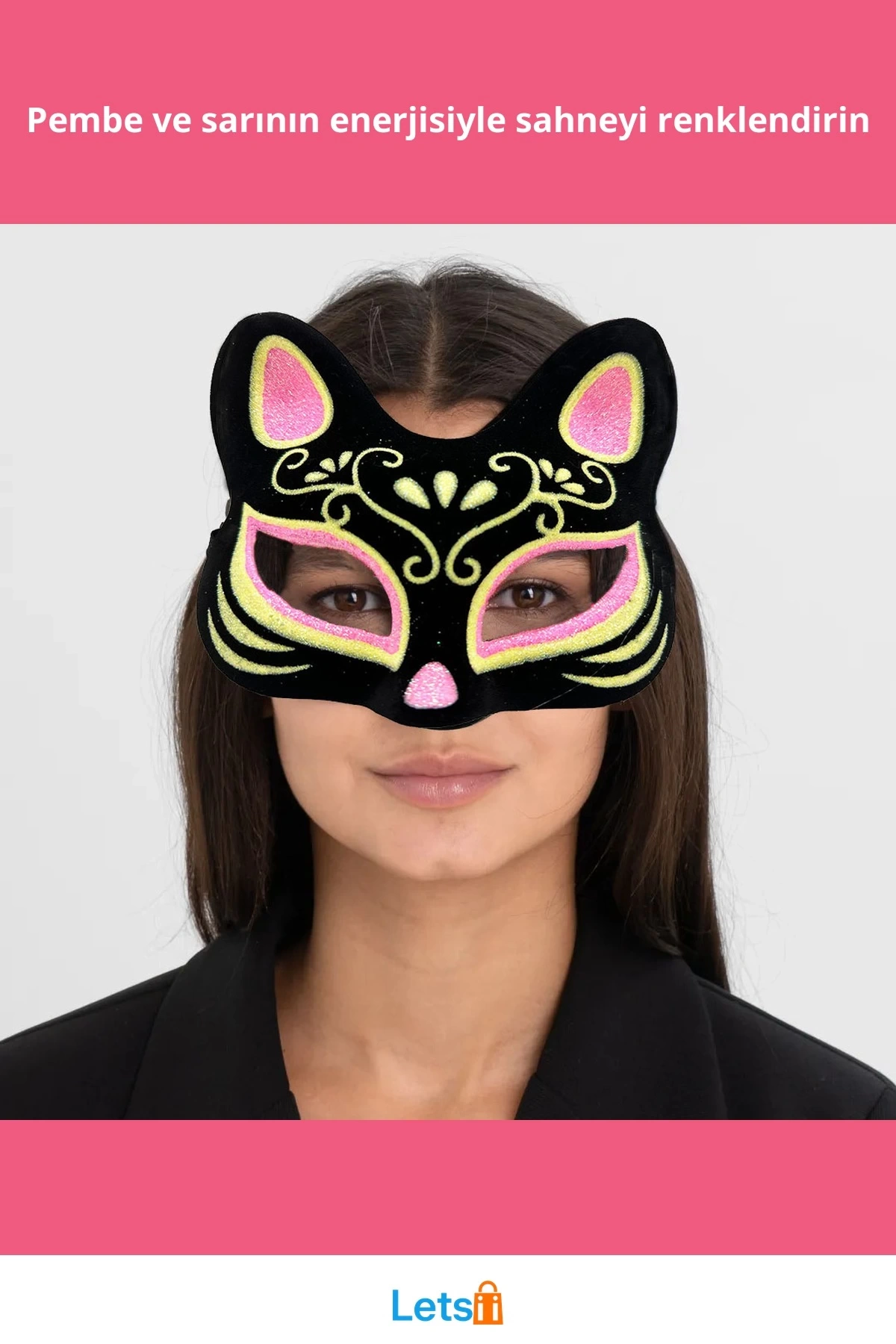 Süet Pembe Sarı Şık Kedi Maskesi 17x14 cm
