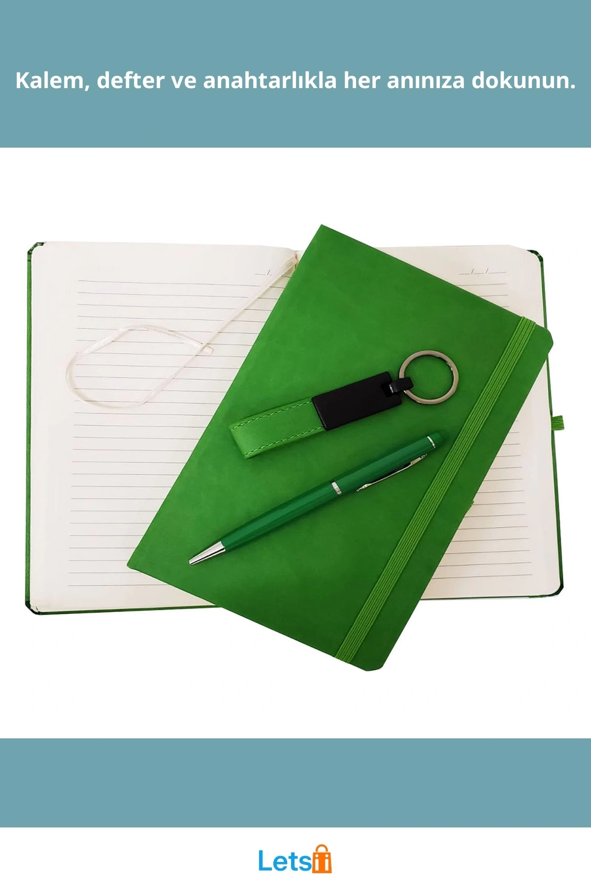Yeşil Termo Deri Kalemli Defter Anahtarlık Seti 21x13 cm