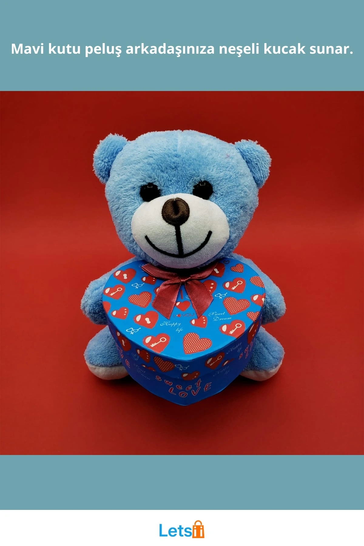 Letsii'nin mavi kutulu ayıcığı, peluş materyaliyle hem yumuşak hem de rahatlatıcı bir dokuya sahiptir.